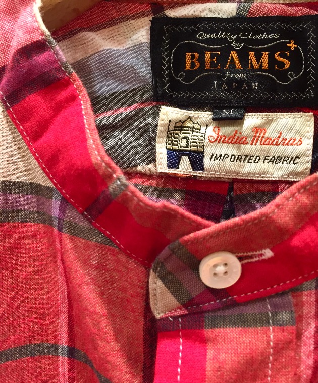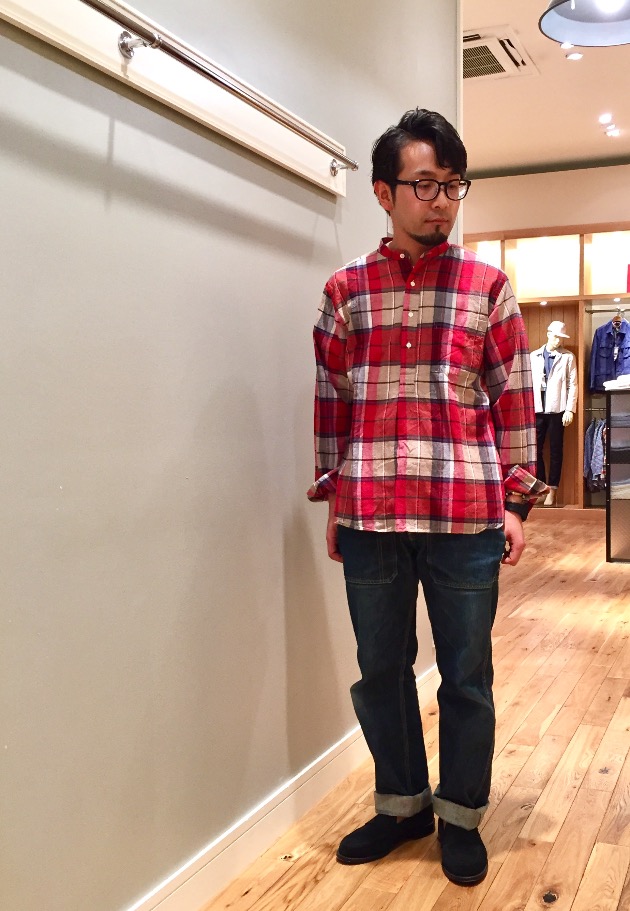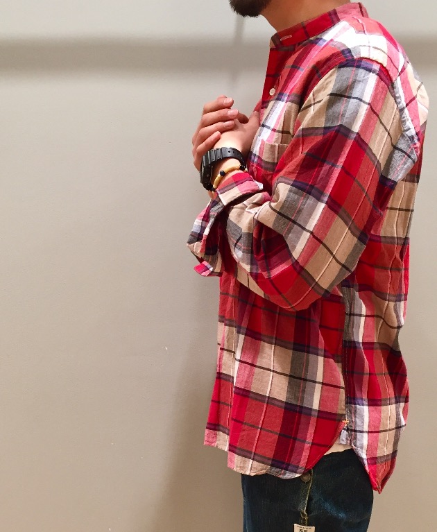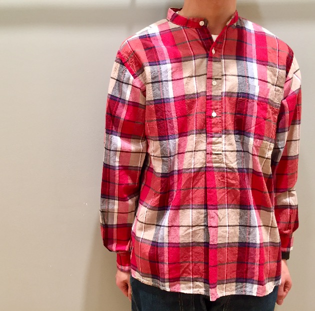 マドラスチェック柄のプルオーバーシャツです。衿元はバンドカラーを採用しており、スッキリとした印象で着ていただけます。