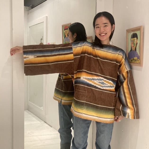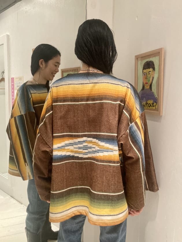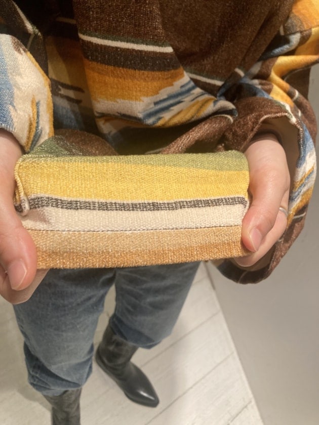 起毛した素材を地染めし、1950年代の手織りのメキシカンブランケットをインクジェットプリントした生地で製作されたものでして、、、