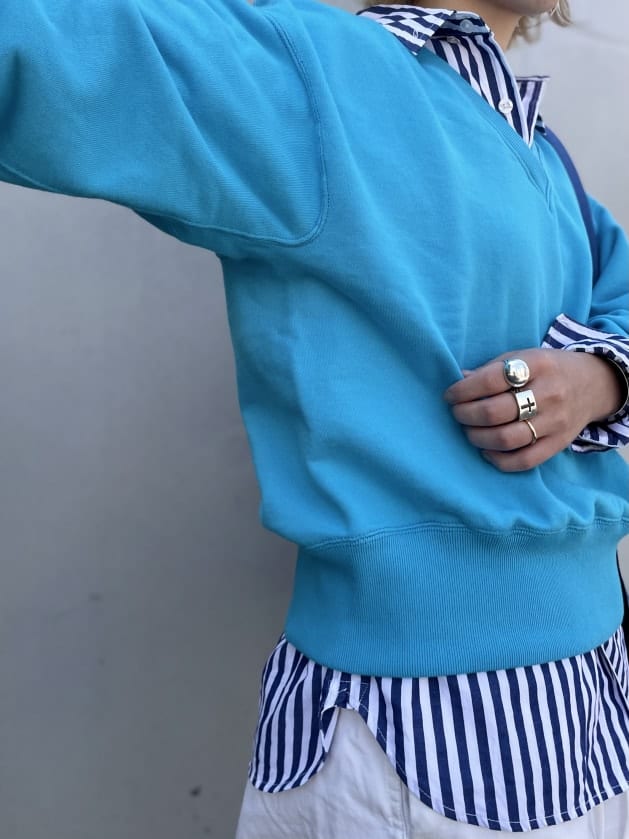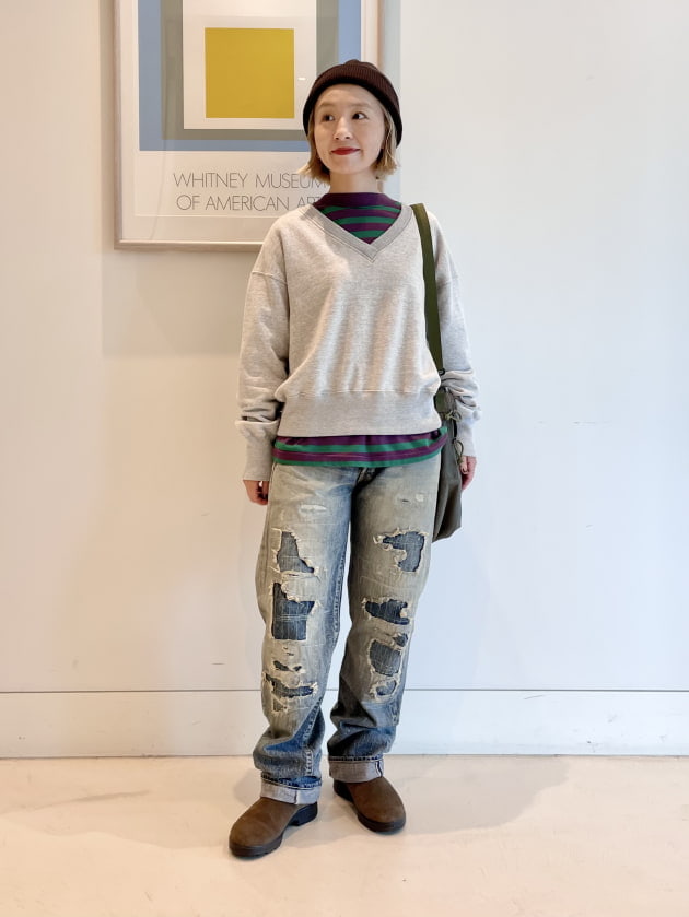 私物はヴィンテージスウェットなので、Vネック部分もややヨレてきており、生地もやれてきた古着独特の風合い。
