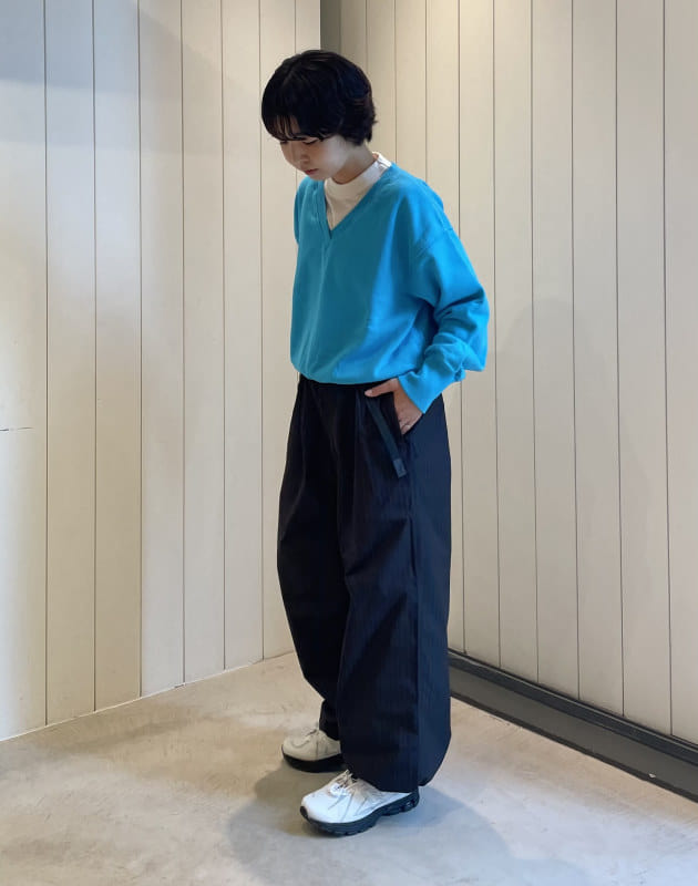 ターコイズブルーのスウェットに合わせて、爽やかなスタイリングですね♡