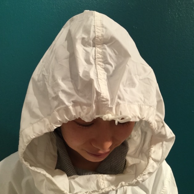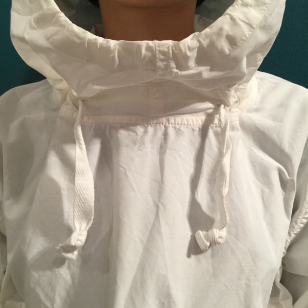 顎まで隠れる大きく膨らんだフードは、ガスマスクを装着するためのもので、こちらのパーカーの特徴です。