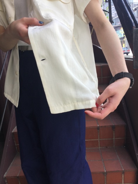 オープンカラーで、ダブルフラップポケットがメンズライクな印象ですが、