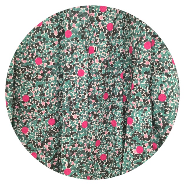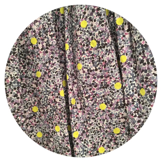 今回は、イエローとパープルの2色です。小花が上品な印象になり、ドットがさりげなくプリントされたデザイン。花柄にドットではありますが存在感が強くなりすぎず意外と馴染むグッドデザイン。