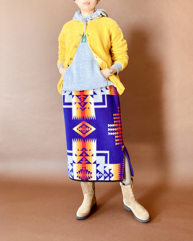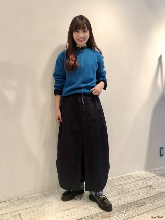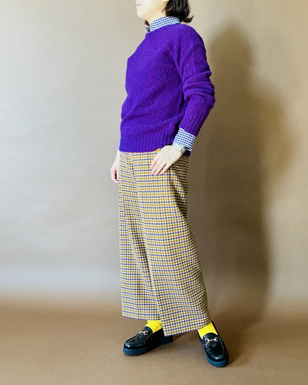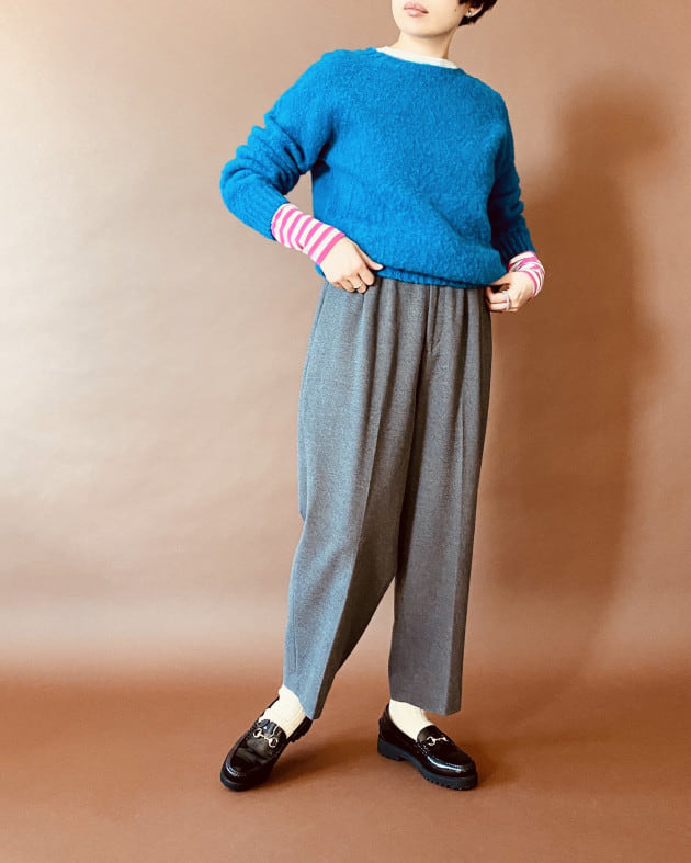 とことんシンプルなコーディネートですが、発色の良いニットが映えて洗練された感じがします。