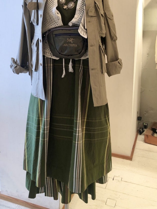 メンズライクなサファリシャツには、フィッシュネットベストを合わせて可愛らしさも忘れずに♡