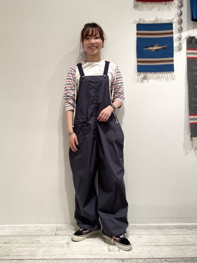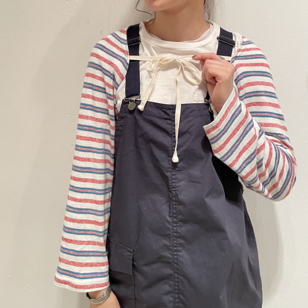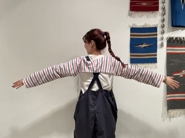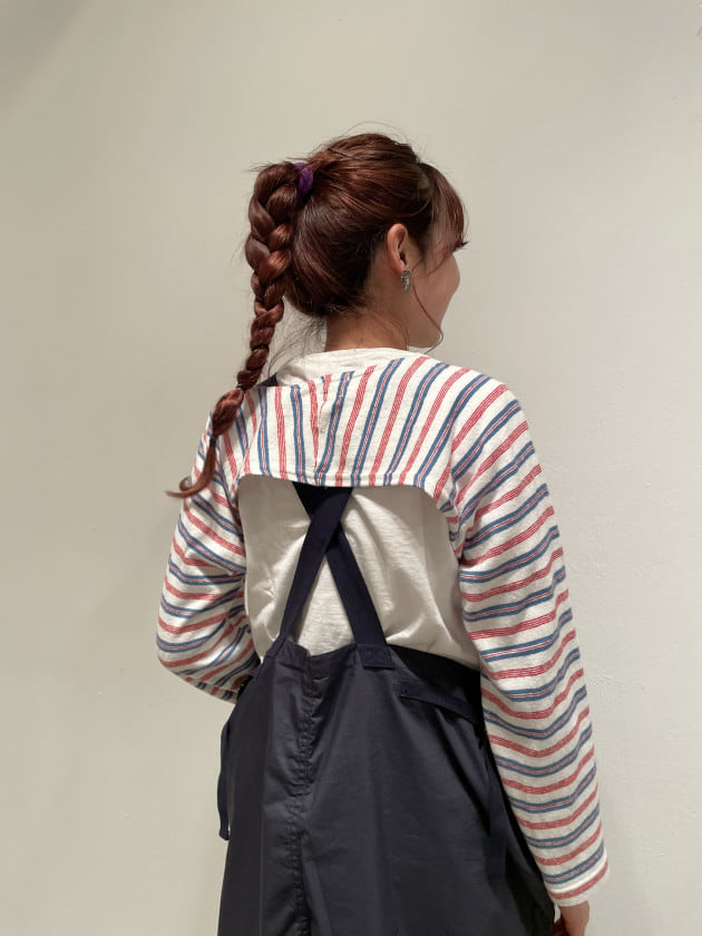 オーバーオールの背中のバッテンに被さる感じも好きです。