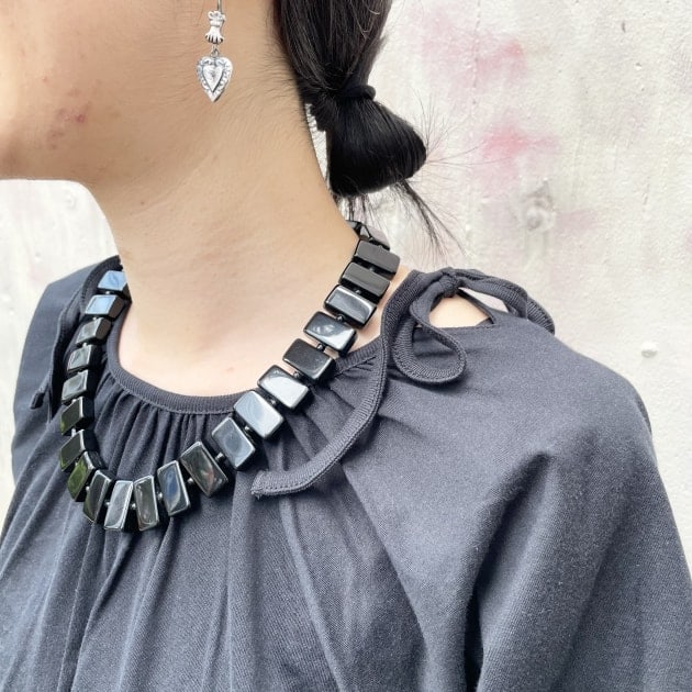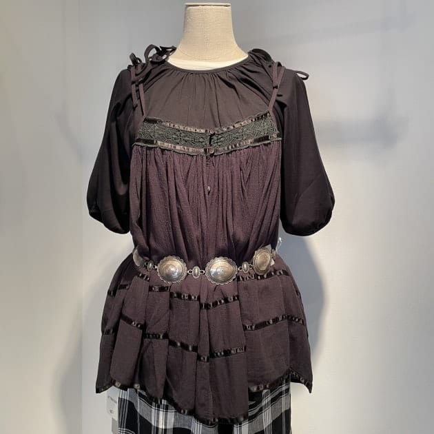 ヴィンテージレースブラウスを前後逆に合わせて、クラシカルな印象にコーディネートしました。
