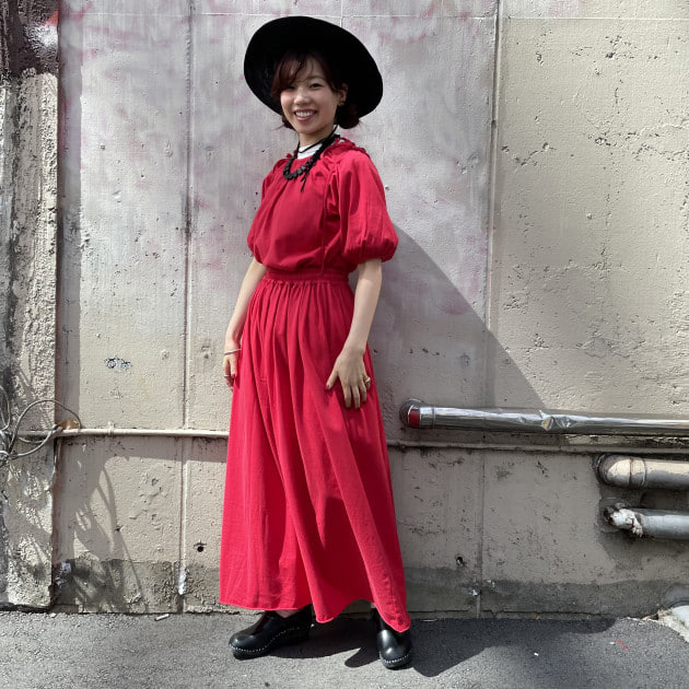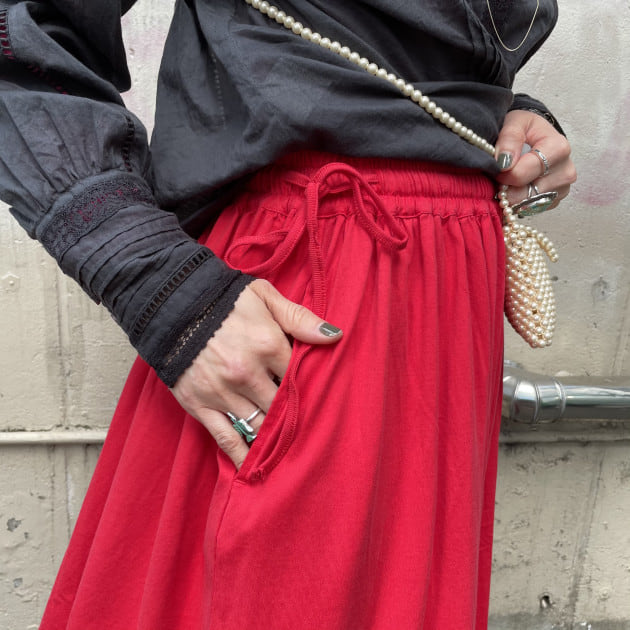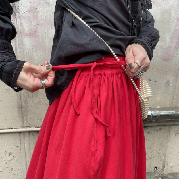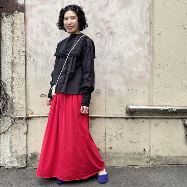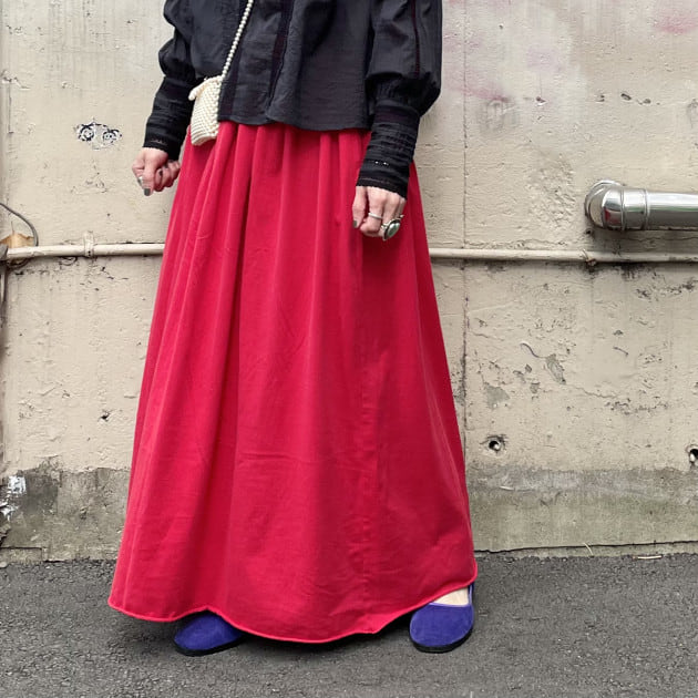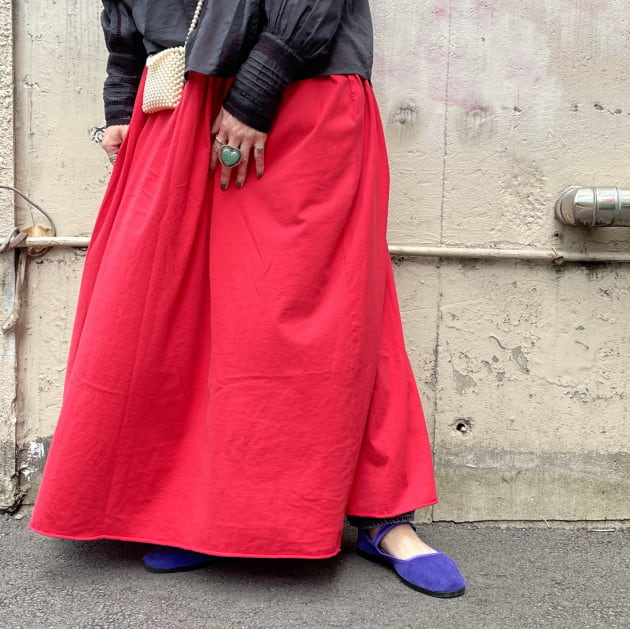 ラフな生地感のスカートですが、お出かけスタイルにもしっかりハマります!