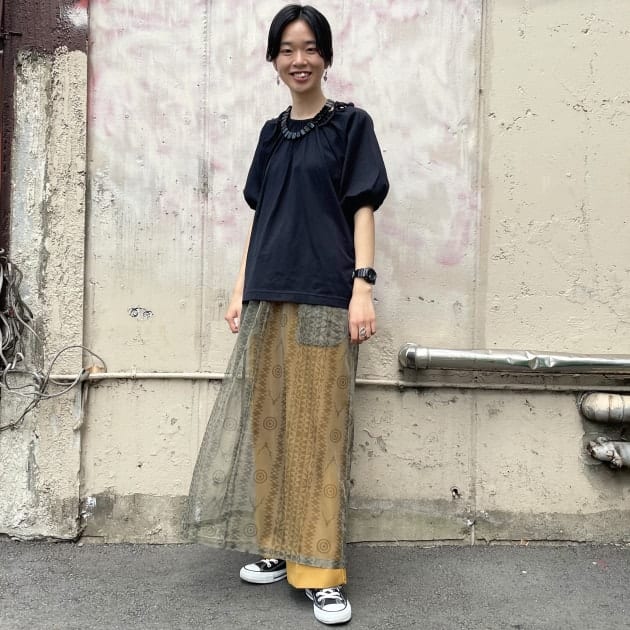 今日は、<SOUTH2 WEST8>のメッシュスカートをプラスして夏のレイヤードスタイルに〜。