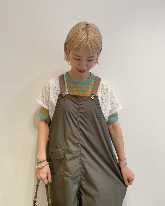 オリーブに相性の良い、オレンジ×ミントグリーンのボーダーTと合わせてみました!
