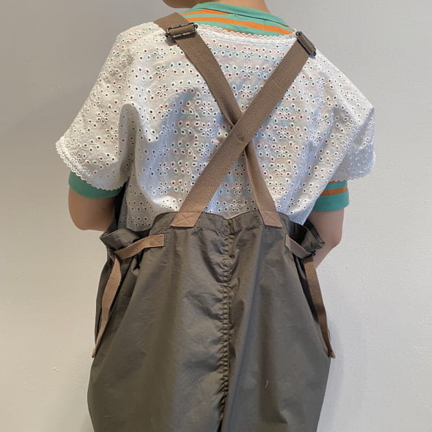 胸当てとサスペンダーがついたオーバーオールスタイルのウェアです。
