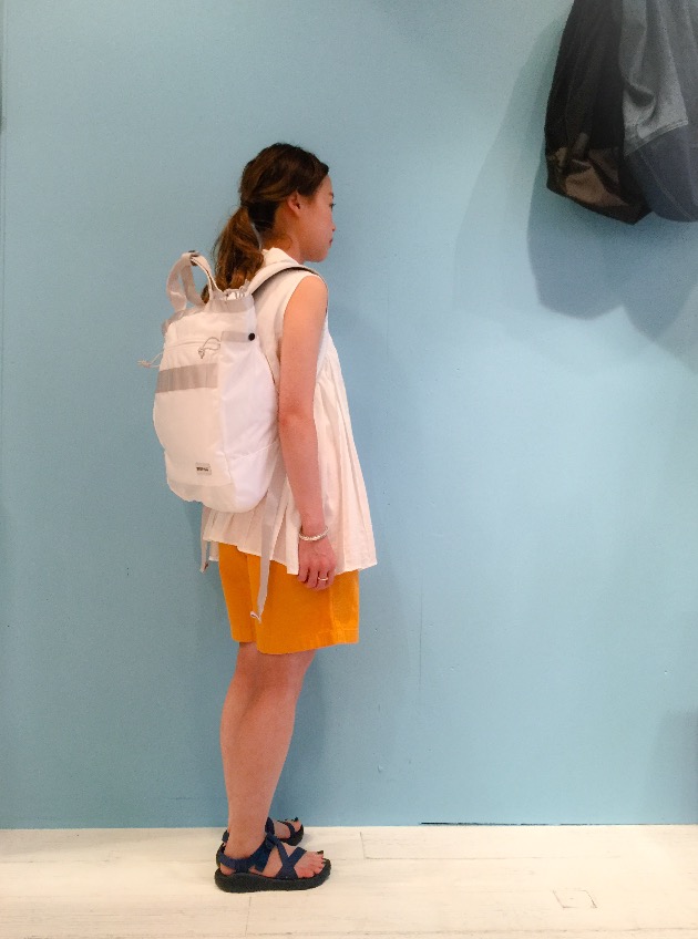 女性らしいアイテムに敢えてのアウトドアショーツを合わせてみました。