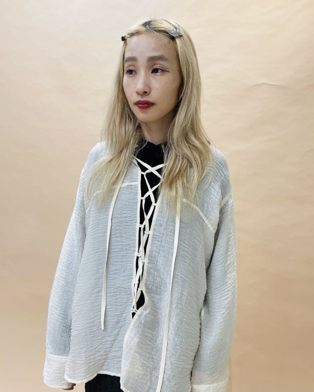 大きく開いたVネックからはレースアップブラウスを見せて。
