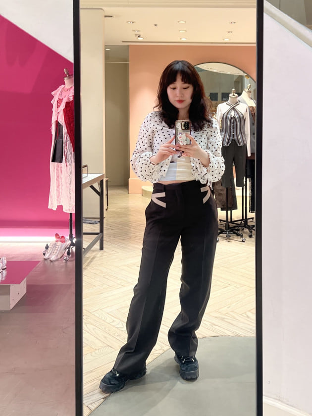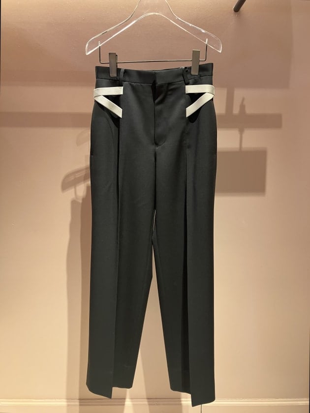 ストレートシルエットのスラックスは