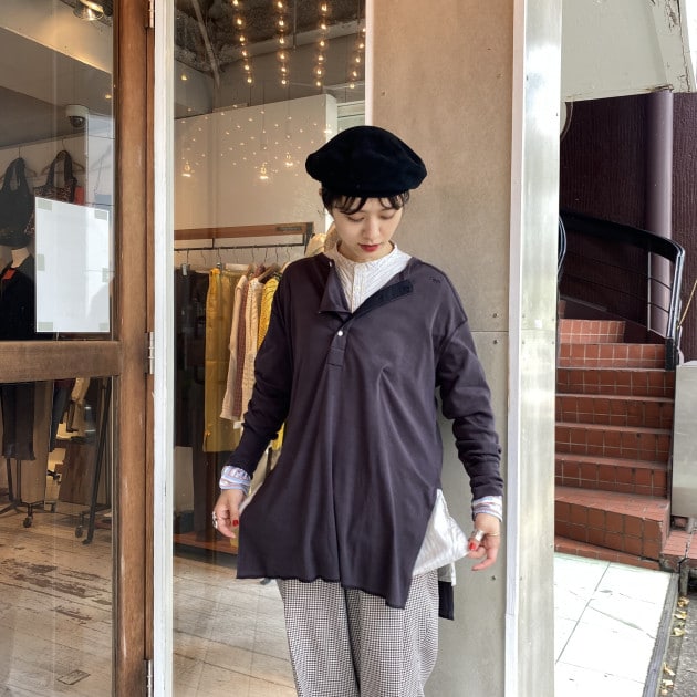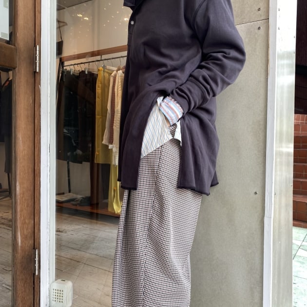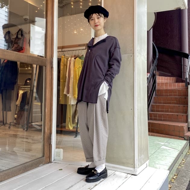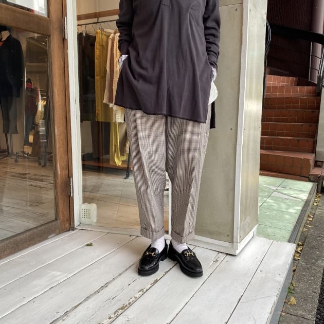 着丈長めで、普段だとインするところをリラックスムード全開で緩めのスラックスと合わせました。