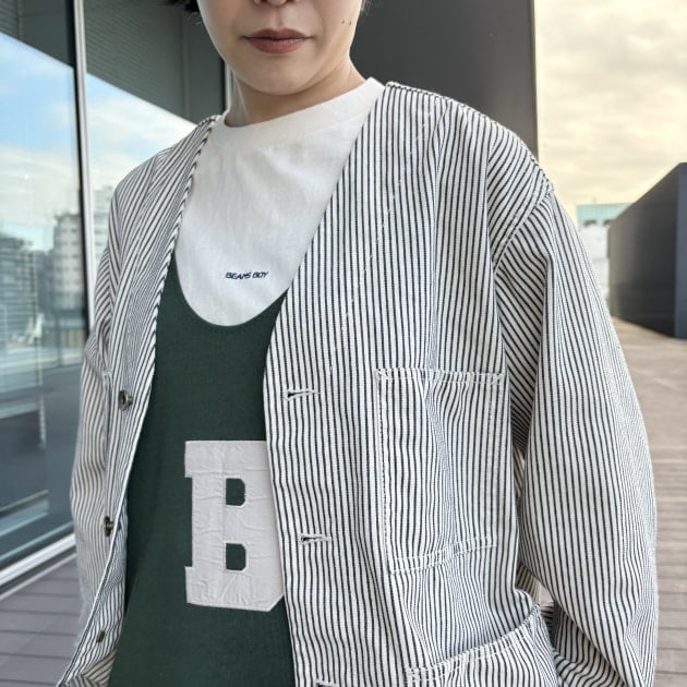 ジャケットは細いストライプ模様。ノーカラーなので軽くサラッと羽織れちゃいます◎