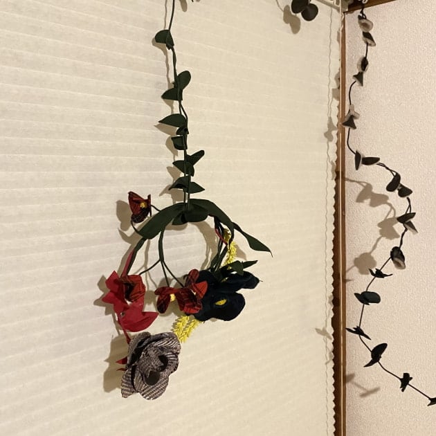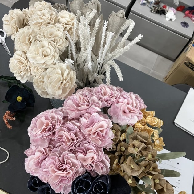 こちらは、お洋服を作る過程で出た残布を使用したテキスタイルフラワーです。