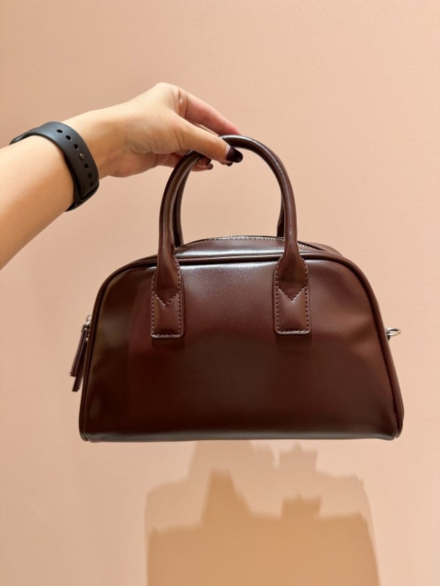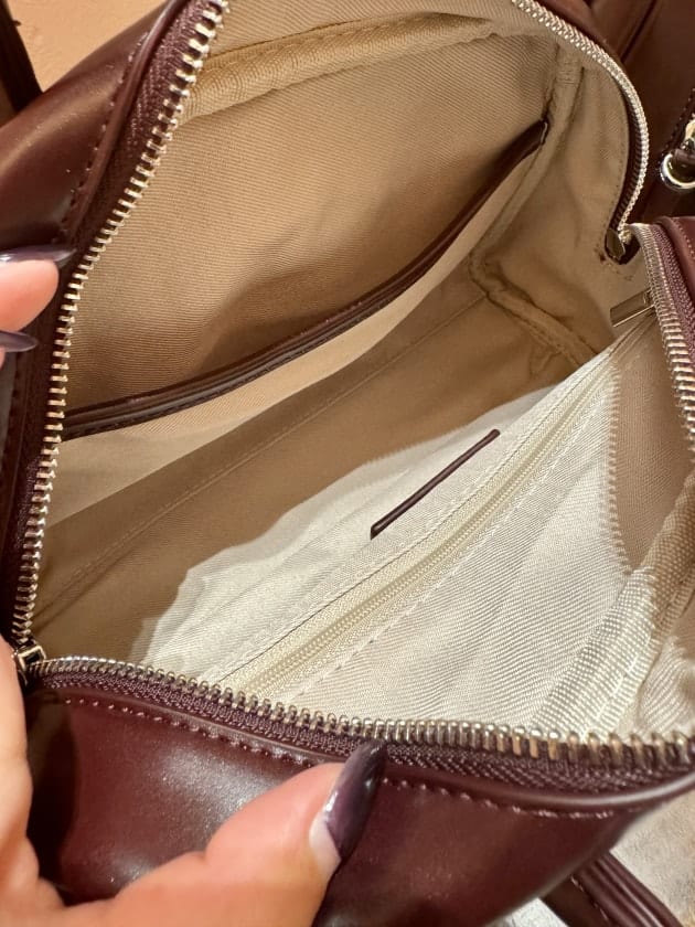 ボルドーに近いブラウンなのですが、合皮でも柔らかくて光沢感があるので綺麗めなコーディネートに合わせやすいかなと思います。