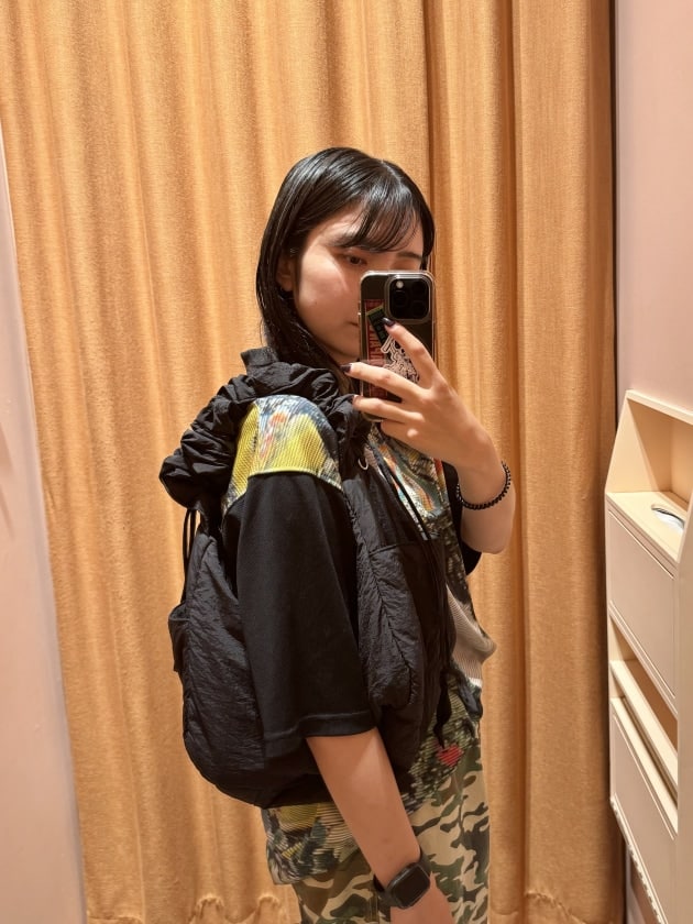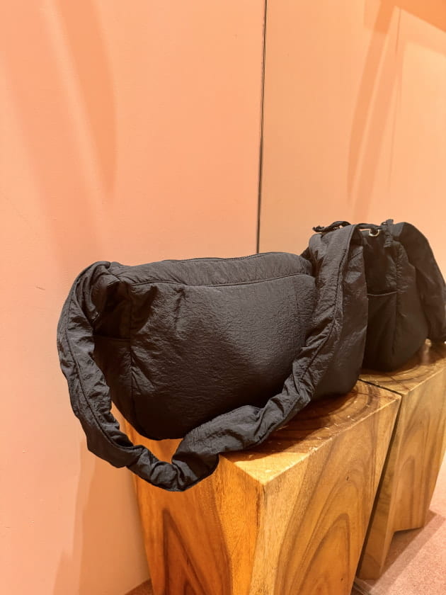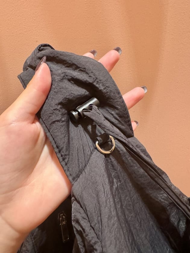 肩紐がコードで調整できるので、長さを調節するのはもちろん、くしゅっと感を出すことで雰囲気を変えて使えます。