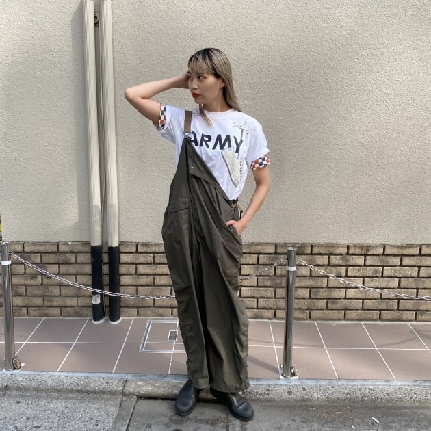 オーバーオールの下にひっそりと隠すのは、もったいないので、片方肩を外して〜