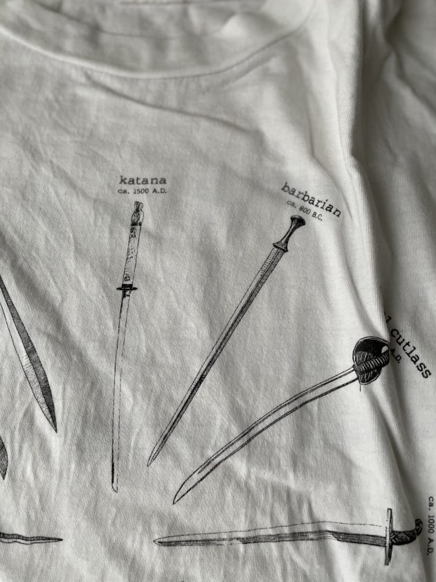 B級だってなんのその、こんなにクールなTシャツがあるんです。劇中に登場する人物の剣がデザインされており、