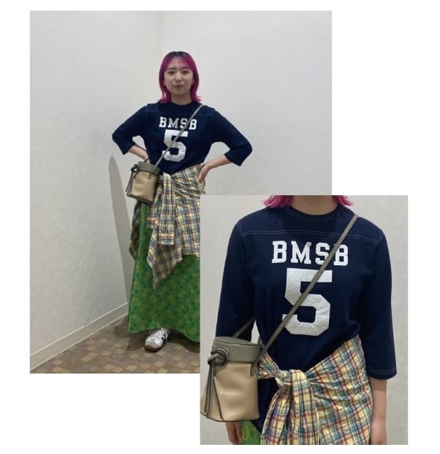 なんと私とインナーのチョイスが一緒!フットボールTですね。デニム合わせだとまた印象が変わりますね!