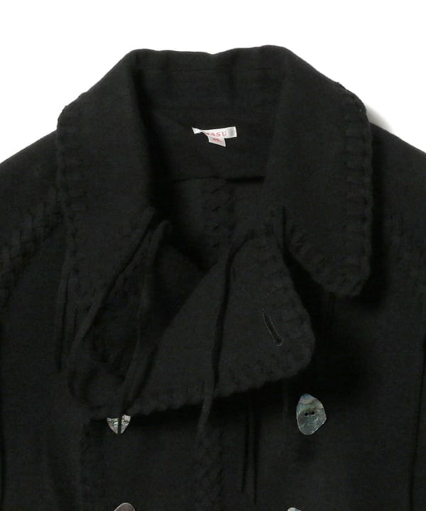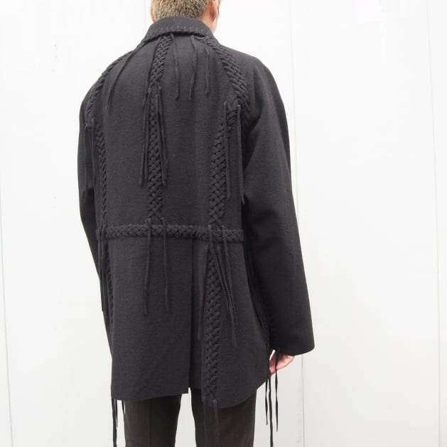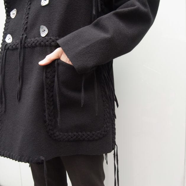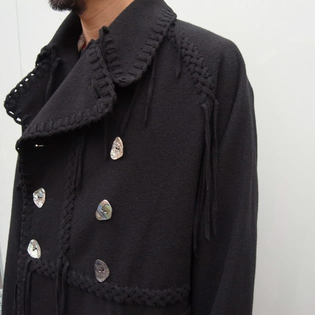 ネイティブアメリカンの革の衣服に使われる編み込みを、手作業で再現したメルトン地のPコートタイプ。