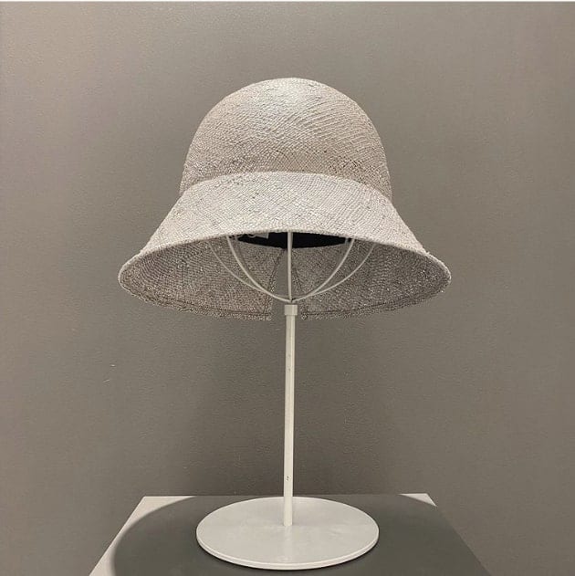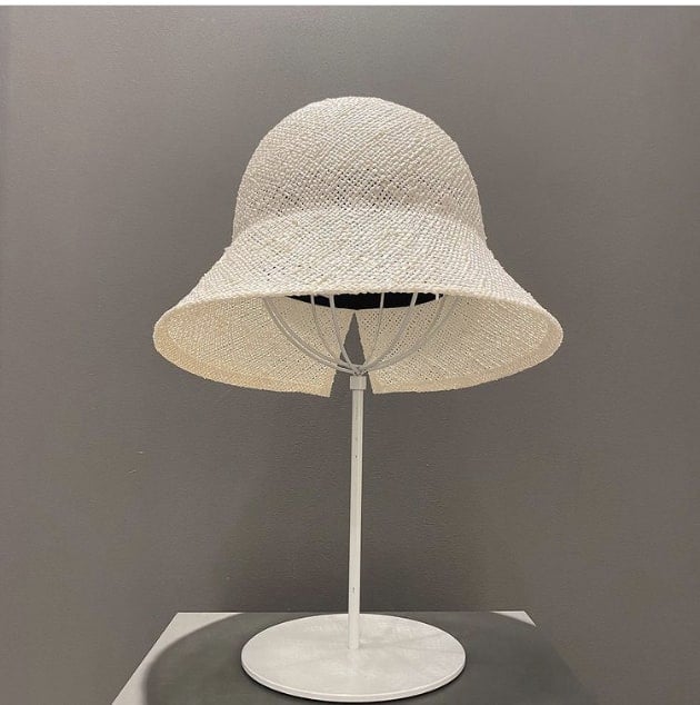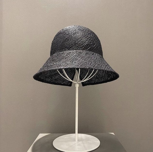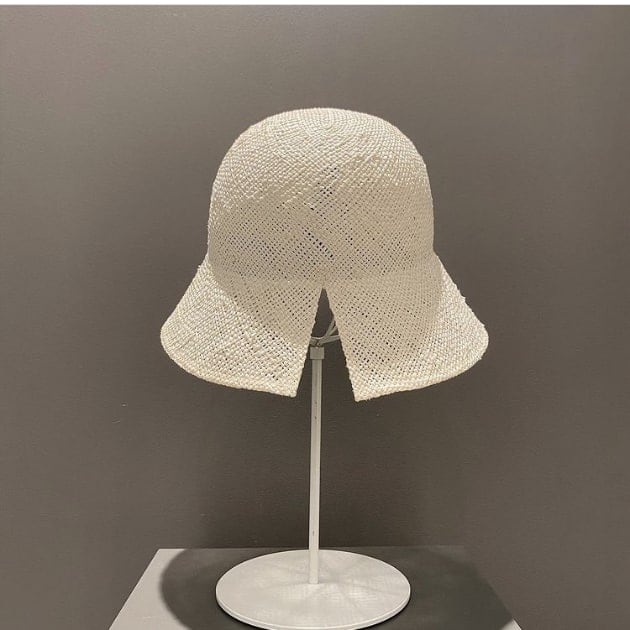 手編みでヴィンテージレースの柄に編んだあと、型にはめて帽子の形にしているんです。