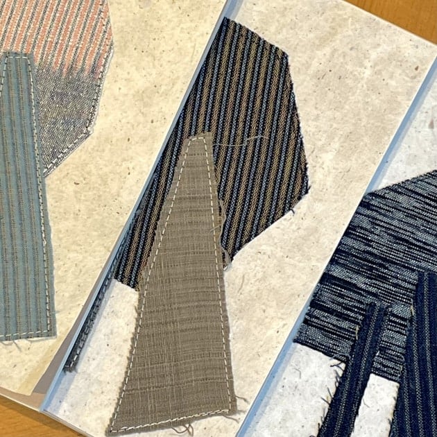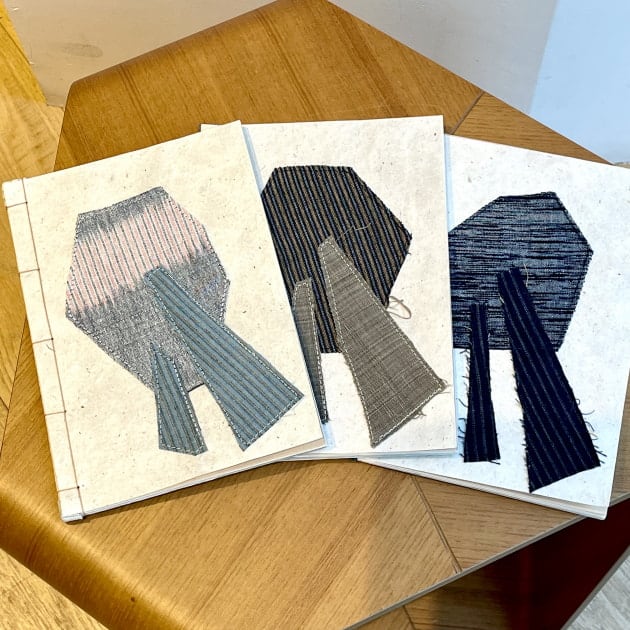 表紙には<おりもんや>染めや織りの生地残布をミシンで縫い付けてあります。