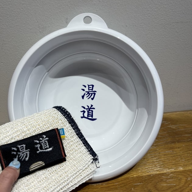 この湯桶は折り畳んでコンパクトに持ち運べます!通常オレンジを販売しておりますが、白地に湯道ロゴが入ったスペシャルバージョンです。