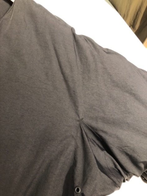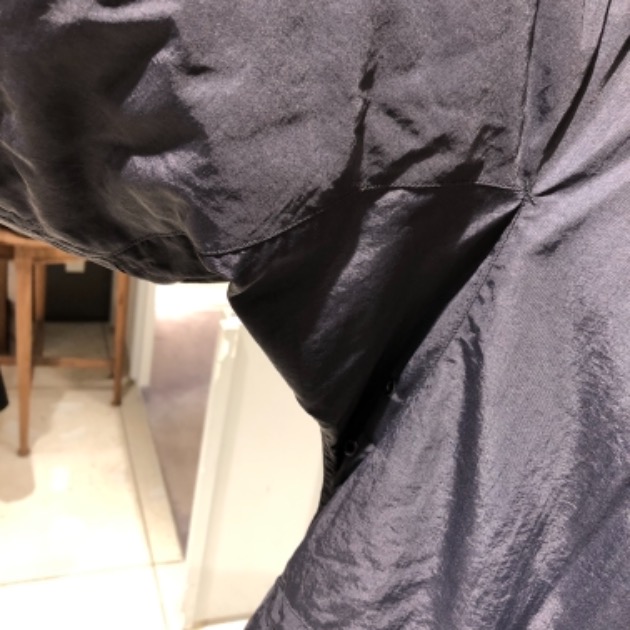ガゼットは、腕を上げた時の運動量を確保し、生地の突っ張りを軽減。ライダースとかにあるディテールですね。