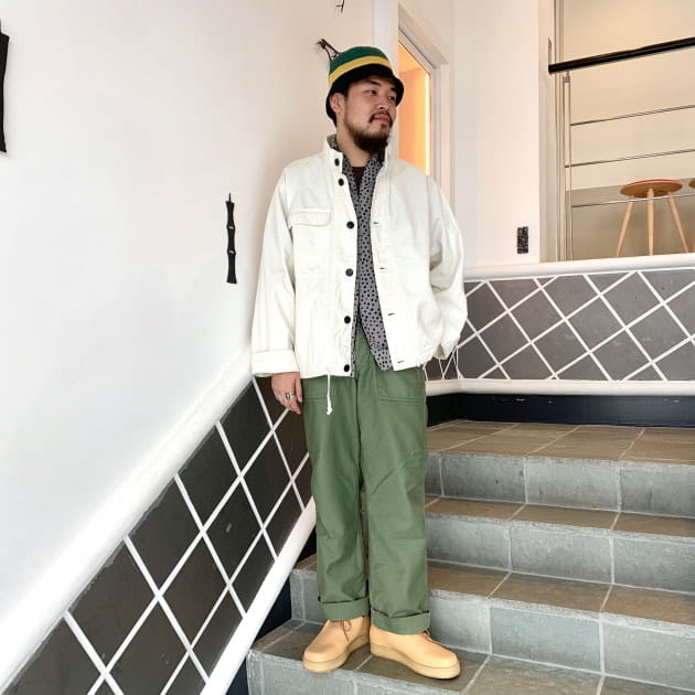 サイズ感も大きめなので、このようにシャツを挟むなどレイヤードスタイルも楽しんで頂けそうですね。