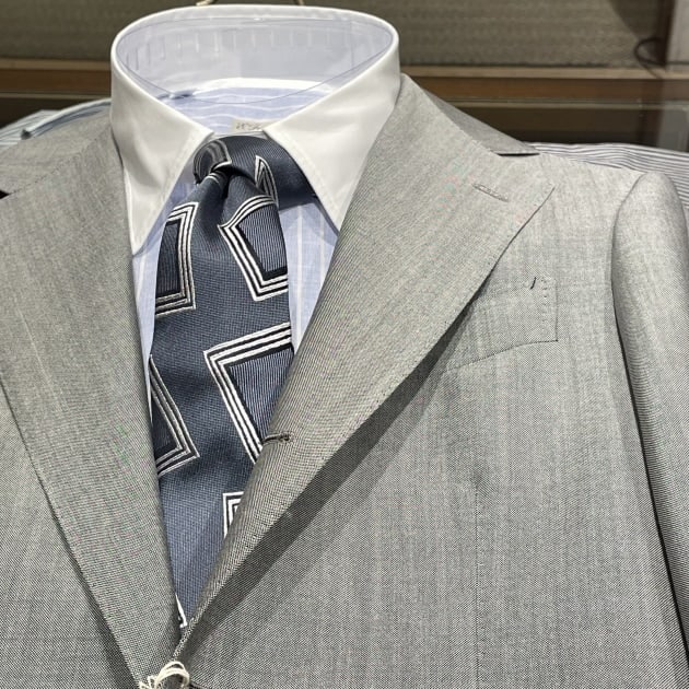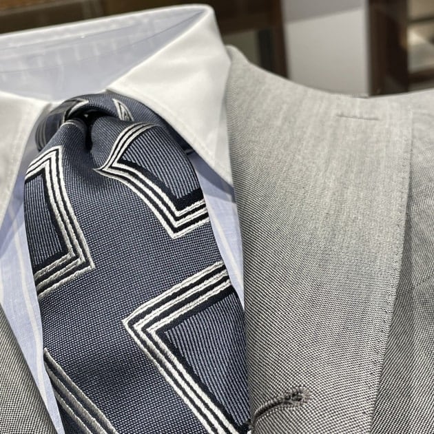 グレーの濃淡でコントラストを付けていますが、スーツと同系色のVゾーン。こんな合わせ方も今風なのかなと思ったりします。モダンな雰囲気と言いましょうか。あくまで個人的な感覚ですが。ご参考まで。本日のネクタイは、