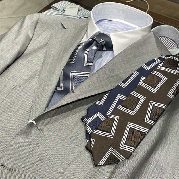<FRANCO BASSI>のダイヤモンド(菱形)モチーフ柄です。大きめの柄ですが、色数が少なく意外とシンプルな見え方。オススメはやはりGREYでしょうか。スーツスタイルに是非。