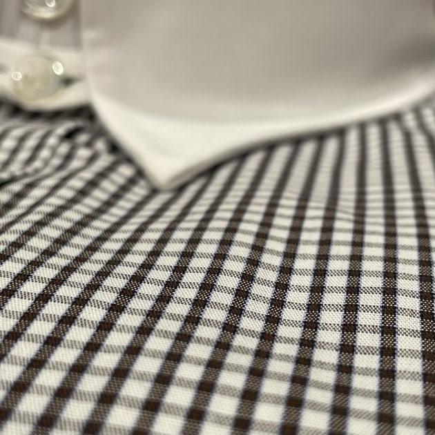 ブラウンの細かいチェックなのですが、薄らとブルーの糸も入っています。こちらも良い生地です。使い易そうですしね。おすすめです。