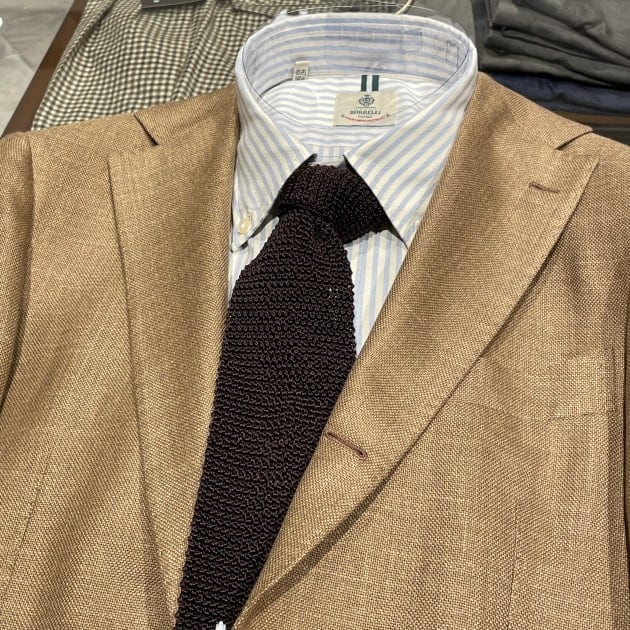 Vゾーン近辺で見てもやはり少しボリューム感があります。オーソドックスなニットタイに見えて、この太さが<Atto vannucci>らしい"エレガントさ"と言えるでしょうか。