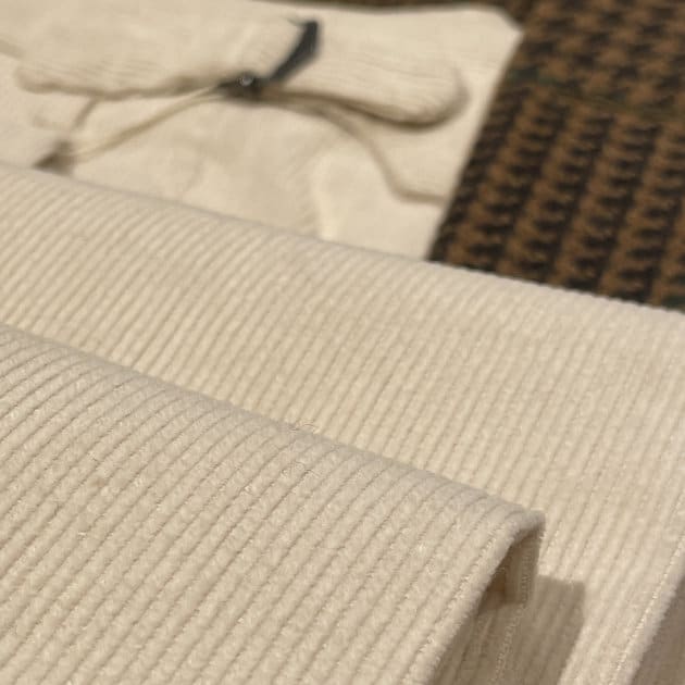 細畝コーデュロイです。コットン100%。クリーム色のような発色ですね。秋冬シーズンらしい柔らかい印象のOFF WHITE。万能ですね。今季トレンドのツイード系ジャケットと合わせると、