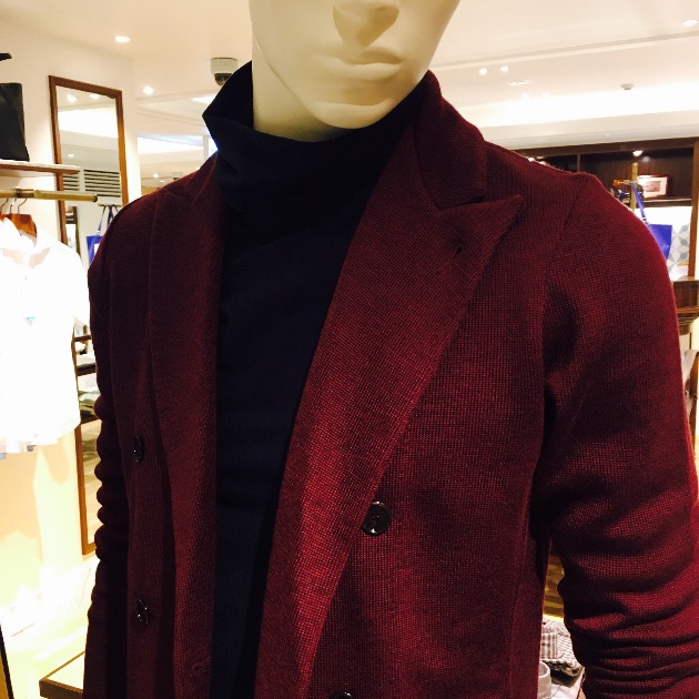 ボルドーのニットジャケットにダークカラーのタートルネックカットソー。