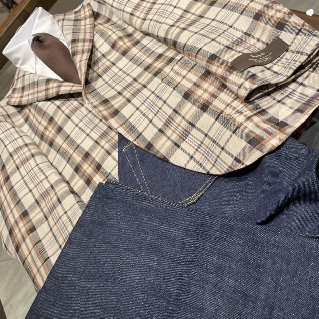 もちろんシャツ・タイを合わせてもアリです。ボトムには5ポケットデニムを持ってきました。