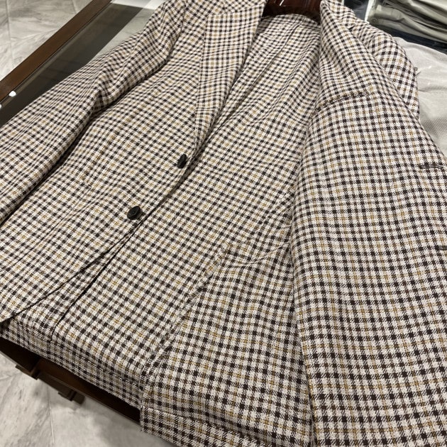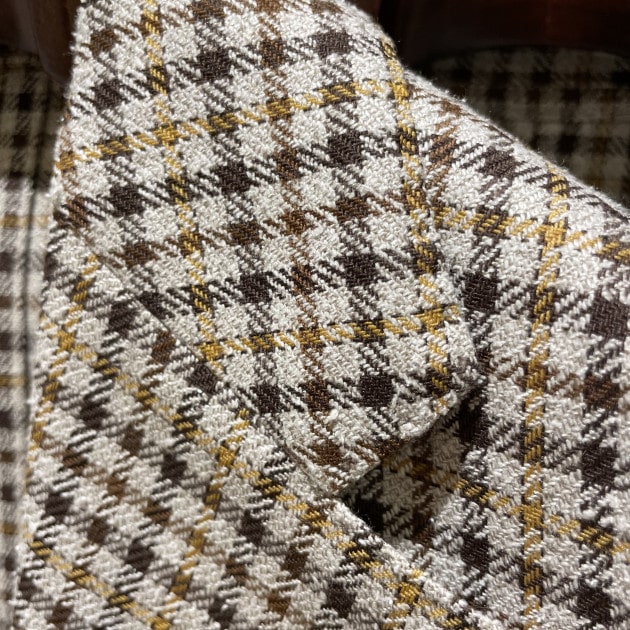 イエローのオーバーペーンがアクセントとなった、ブラウン系のガンクラブチェック。素材はウール73%/シルク27%です。ドライなタッチで軽い生地感。