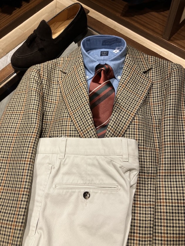 ジャケットの色とネクタイの色をリンクさせてみました。土っぽさを残しかったので、白ではなく、オフホワイトのカラーのパンツを選びました。シャンブレーシャツもワントーン明るいものを選び、バランスを取っています。