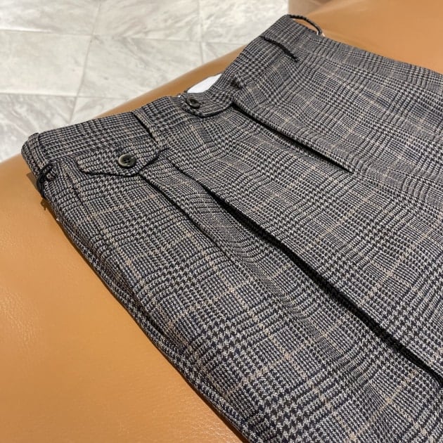 無地のスラックスとはガラッと雰囲気を変えて頂けますね。グレンプレイド系は比較的履き易い柄ですので、是非。