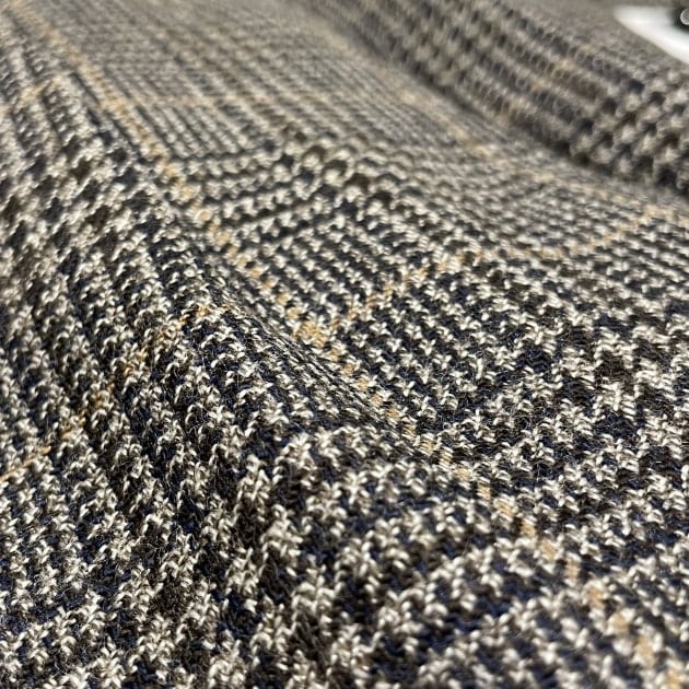 カラー表記はBROWNですが、グレイッシュな見え方のグレンプレイドにBEIGEカラーのオーバーペーン。よく見るとNAVYカラーの糸も混ざっており、深みのある色柄となっております。素材はウール100%。