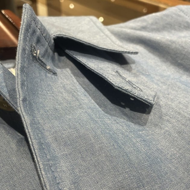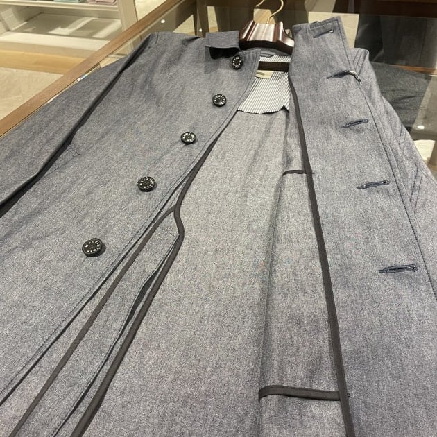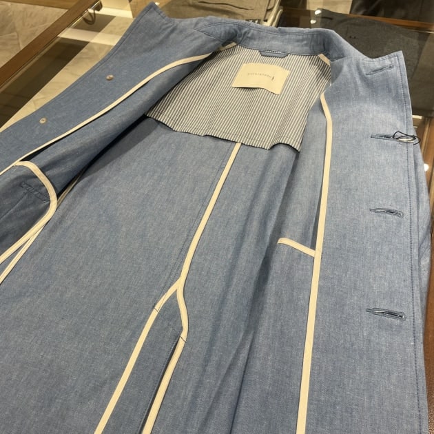 やや短い丈感と、ボタンスルー仕様のフロント、ダンガリーの素材感。程よくカジュアルで、軽快な雰囲気のスプリングコートとです。気になる方は是非お早めに。