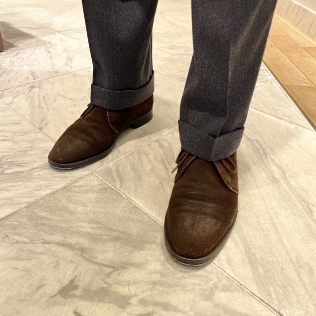 シューズはスウェードのチャッカブーツで、ここもやや王道よりはやや変化球な印象。