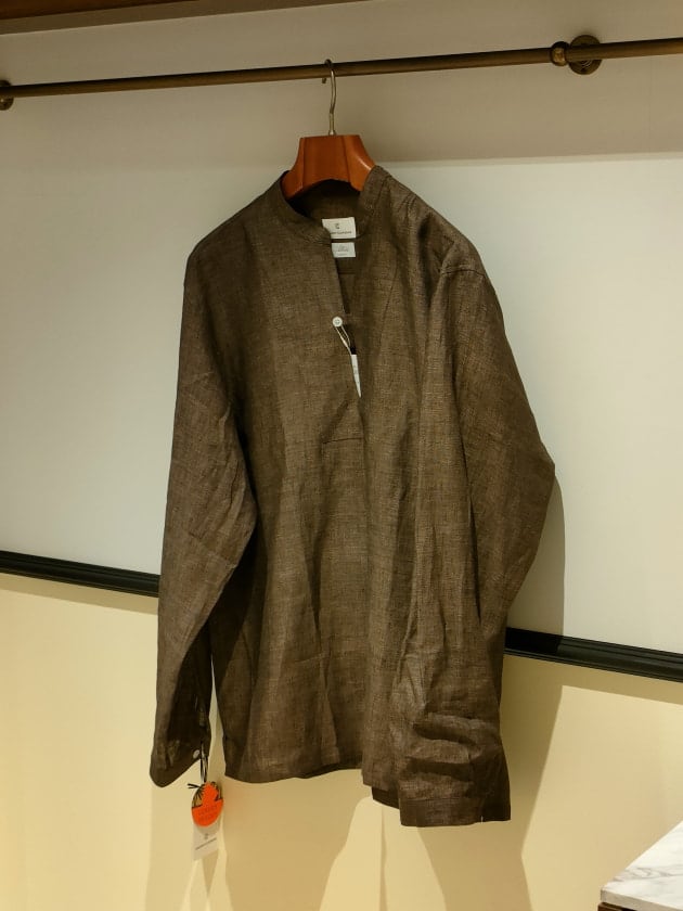 最後はこちら。たっぷりとしたボディとスタンドカラーの表情が絶妙なアフリカンシャツ。裾がスクエアカットなので身幅にゆとりがあってももたつかないのも魅力の一つ。