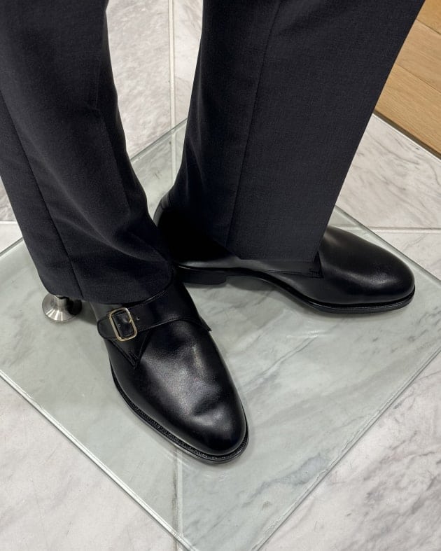 シューズは〈Lloyd Footwear〉のシングルモンク。内羽根のレースシューズで真面目に合わせるのも間違いありませんが、力み過ぎず少し抜いて軽快にしてみました。