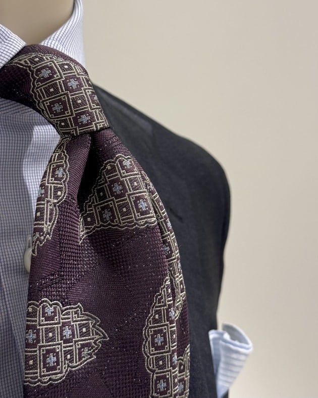 ネクタイは〈JOHN COMFORT〉のジャガードタイ。パープルベースに中〜大柄のペイズリー。シルバーとブルーで構成された重すぎないバランスが洒落てます。