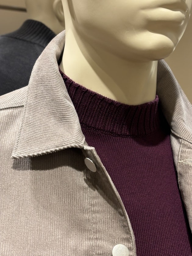 着用すると襟の見え方はこのような感じ。クルーネック以上、モックネック以下という感じでしょうか。最近の冬はあまり寒くないので、タートルやモックネックはトゥーマッチ。というお客様も結構多いのですよね。襟型として今の時代感にもマッチしているのかもしれませんね。
