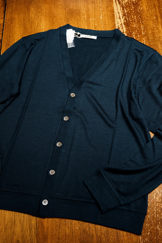 細番手のウール糸を使用し、上品な光沢と軽やかな着心地を実現した<SLOANE>の別注Vネックカーディガン。生地・ボタン・サイズバランスに手を加え、着丈を短く仕立てた特別仕様は、オンオフ問わず活躍する万能な一着です。